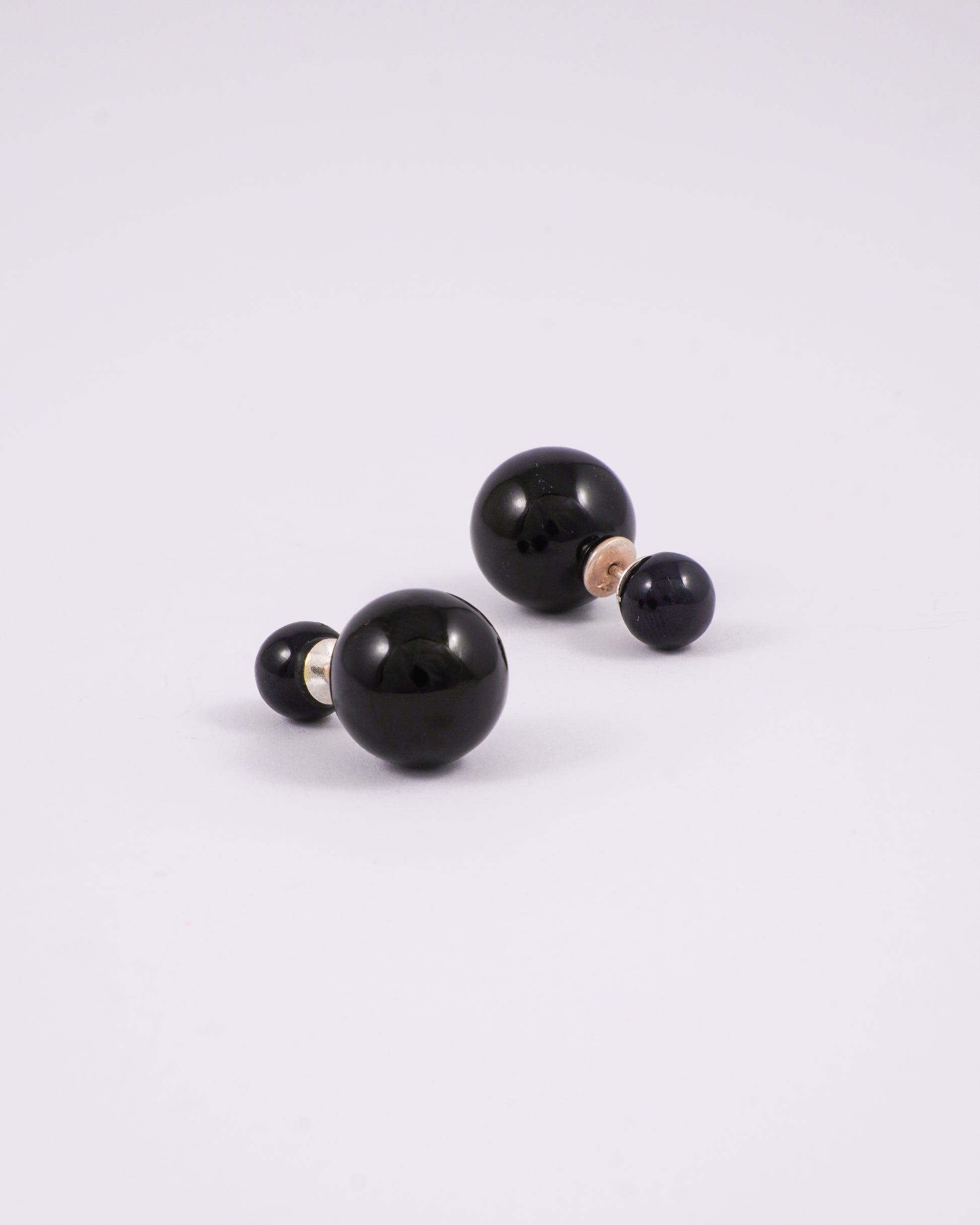 Captivating sterling silver earrings showcase sleek black orbs that add a touch of mystery and sophistication. The contrast between the deep black and polished silver creates a bold, eye-catching look, perfect for elevating both everyday and evening ensembles.